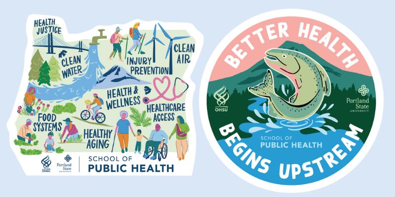 PORTLAND, OR – In celebration of 10 years of transformative partnership, the OHSU-PSU School of Public Health (SPH) is proud to unveil two new commemorative sticker designs. These visual narratives reflect a decade of dedication to health equity and the “upstream” mission that defines our faculty, staff, and students.