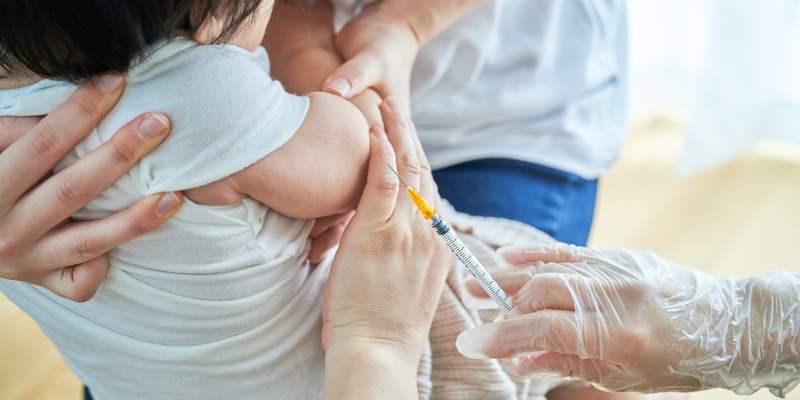 Baby getting a Hepatitis B Vaccination while being held by their parent and nurse at a clinic in Portland, OR